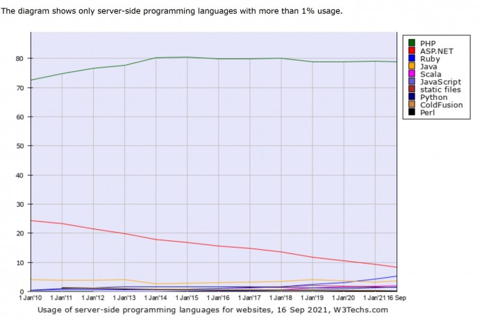 根據(jù)調查,PHP 在 2010 年的市場份額為 72.5%,而在 2021 年占比達到 78.9%。只有一個其他的服務器端語言曾經突破 10% 的份額--這個競爭對手是 ASP.NET,它在 2010 年擁有令人印象深刻的 24.4% 的份額,但在 1 月份下降到 9.3%,這個月下降到 8.3%。