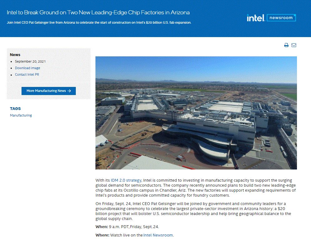 該計劃在經(jīng)過了半年的準備時間之后,英特爾正式宣布將于9 月24 日舉行新晶圓廠建造的動土奠基儀式,Pat Gelsinger 將與當?shù)刂饕賳T出席這次活動,這也將是美國亞利桑那州歷史上最大規(guī)模的私營企業(yè)投資計劃。