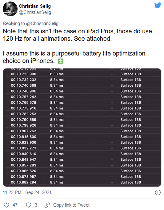 目前,由于對(duì)標(biāo)準(zhǔn)動(dòng)畫的支持有限,像滾動(dòng)這樣的互動(dòng)和關(guān)閉彈出窗口這樣的互動(dòng)之間會(huì)有明顯的區(qū)別。例如,如果你在 iPhone 13 Pro 或 Pro Max 上滾動(dòng)瀏覽 Twitter,你會(huì)看到流暢的滾動(dòng)體驗(yàn),但尚未更新到 120Hz 的動(dòng)畫被限制在 60Hz,而這些動(dòng)畫的流暢度明顯降低。這個(gè)反差問題將隨著開發(fā)者在未來采用對(duì) ProMotion 功能的全面支持而得到解決。
