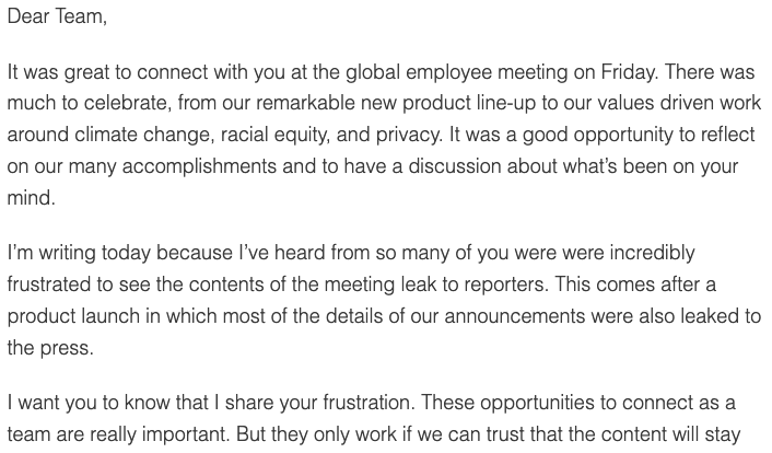 另外,蘋果在 9 月 17 日舉行了一場全體員工大會,要求對未接種疫苗的員工進行頻繁檢測,但沒有強制要求接種疫苗。不料,這場大會的內(nèi)容也被泄露給了媒體。