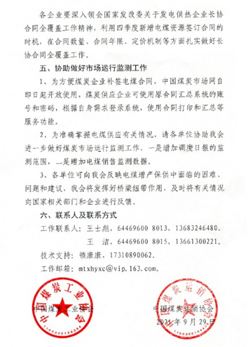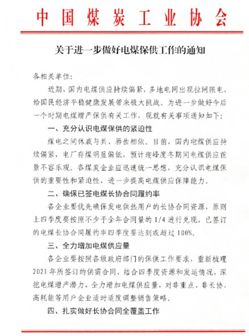 9月30日,中國(guó)煤炭工業(yè)協(xié)會(huì)、中國(guó)煤炭運(yùn)銷協(xié)會(huì)發(fā)布通知,要求進(jìn)一步做好電煤保供工作,要求各企業(yè)要深挖電煤增產(chǎn)潛力,全力增加電煤供應(yīng)量,各企業(yè)要優(yōu)先確保發(fā)電供熱用戶的長(zhǎng)協(xié)合同資源,原則上四季度要按照不少于全年合同量的1/4進(jìn)行兌現(xiàn),已簽訂的電煤長(zhǎng)協(xié)合同履約率四季度要達(dá)到或超過(guò)100%。