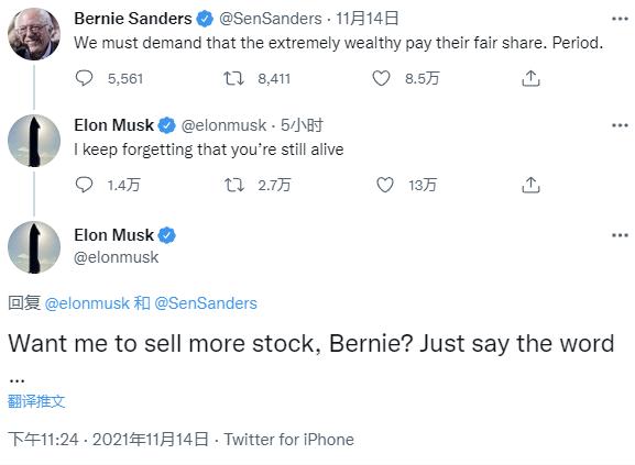 馬斯克回應(yīng)桑德斯的推文稱,“我一直忘了你還活著呢”。在隨后一條推特中,馬斯克問:“伯尼,想讓我賣出更多股票嗎?直說好了……”