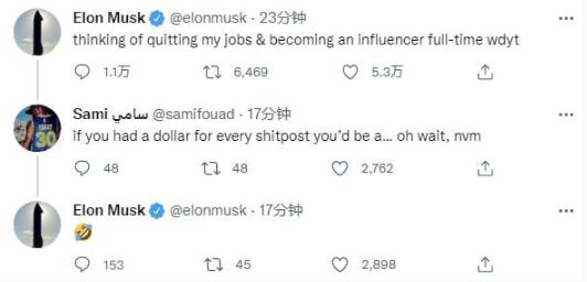 特斯拉 CEO 埃隆?馬斯克在 Twitter 上表示,他正在考慮辭職做一名全職網(wǎng)紅,并詢問網(wǎng)友怎么看。有網(wǎng)友戲稱,如果他能每條推收費(fèi)一美元的話,他早就是.... 等等,好像馬斯克本來就是億萬富翁啊!