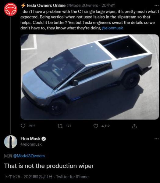 12 月 12 日消息,特斯拉電動(dòng)皮卡 CyberTruck 原型上最近出現(xiàn)的超大雨刷吸引了很多粉絲關(guān)注。但該公司首席執(zhí)行官埃隆·馬斯克(Elon Musk)周六證實(shí),這款雨刷不會(huì)出現(xiàn)在 CyberTruck 量產(chǎn)版本上。