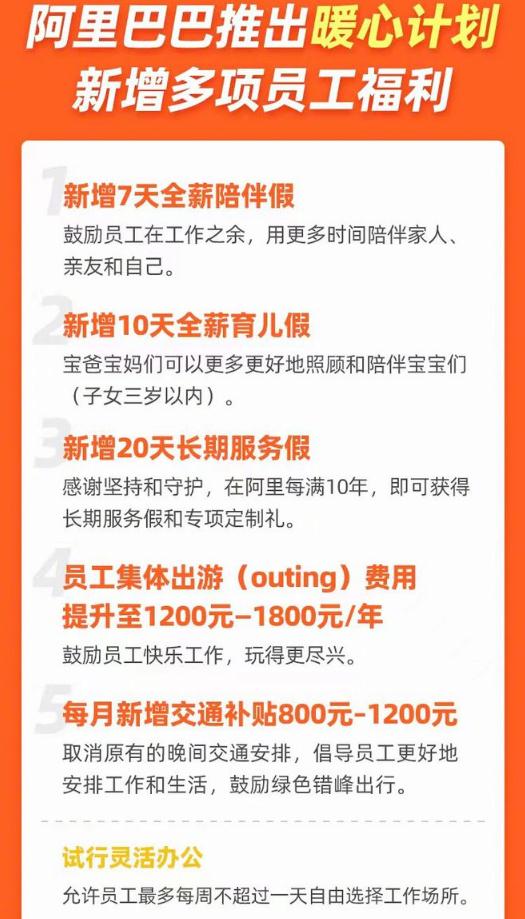 12 月 14 日消息,據(jù)悉,阿里巴巴今日在內(nèi)網(wǎng)公布了多項(xiàng)針對(duì)員工關(guān)懷的“暖心計(jì)劃”,包含多項(xiàng)員工福利升級(jí)——除率先響應(yīng)國(guó)家號(hào)召延長(zhǎng)產(chǎn)假、新增育兒假外,并推出了 7 天全薪陪伴假、20 天全薪長(zhǎng)期服務(wù)假,同時(shí)新增交通補(bǔ)貼倡導(dǎo)綠色錯(cuò)峰出行,提高員工集體出游(Outing)費(fèi)用標(biāo)準(zhǔn)。此外,阿里巴巴還將試行靈活辦公制度,允許員工每周最多一天可自由選擇辦公地點(diǎn)。