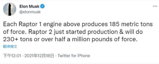 馬斯克還表示,一個(gè) Raptor 1 猛禽一代發(fā)動(dòng)機(jī)可以產(chǎn)生 185 公噸的推力,而 Repter 2 發(fā)動(dòng)機(jī)剛剛開(kāi)始量產(chǎn),單個(gè)推力提升至 230 噸。