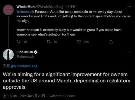 名為@WholeMarsBlog 的特斯拉車主發(fā)帖稱,歐洲許多特斯拉用戶抱怨稱,“Autopilot 不按規(guī)定限速,在通過交通標(biāo)志前也沒有達(dá)到正確的速度。”馬斯克回應(yīng)了這條推文,稱特斯拉 Autopilot 團(tuán)隊的目標(biāo)是根據(jù)監(jiān)管部門的批準(zhǔn),在明年 3 月份左右為非美國車主提供重大升級。