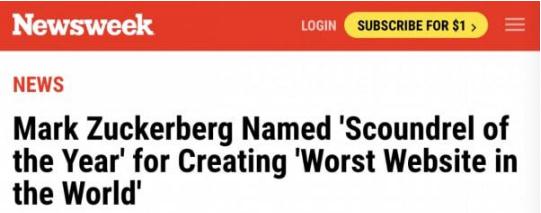 據美國《新聞周刊》報道,社交平臺臉書的創(chuàng)始人扎克伯格日前被《新共和》(The New Republic)刊物評為“年度惡人”,理由是他創(chuàng)建了“世界上最糟糕、最具破壞性的網站”。