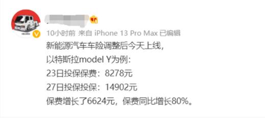 有網(wǎng)友曝光,同樣是特斯拉 Model Y,23 日投保的費用為 8278 元,而 27 日新政之后,投保費用暴漲到 1.4 萬多元,漲幅高達 80%。