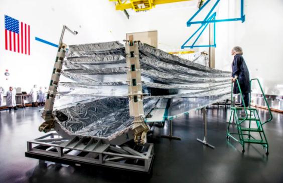 展開過(guò)程的一部分需要部署 JWST 的遮陽(yáng)板。JWST 觀測(cè)的是紅外光,這是一種與熱有關(guān)的不可見光。正因?yàn)槿绱?,望遠(yuǎn)鏡必須保持極低的溫度才能正常工作,大約在華氏零下 370 度下工作。遮陽(yáng)板由五層薄薄的反射材料 Kapton 組成,旨在防止太陽(yáng)的熱量把望遠(yuǎn)鏡烤得太熱。