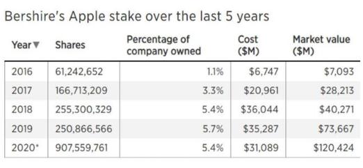 該公司在2020年年報(bào)中表示:“伯克希爾對(duì)蘋果的投資生動(dòng)地說明了股票回購的力量。盡管我們在2020年出售了蘋果股票,但伯克希爾現(xiàn)在卻擁有蘋果5.4%的股份。這一增長對(duì)我們來說沒有付出成本,這是因?yàn)樘O果不斷回購其股票,從而大幅縮減了目前的流通股數(shù)量。”