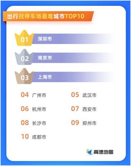 根據(jù)實(shí)際出行找停車場(chǎng)的頻次和花費(fèi)時(shí)間綜合分析,高德地圖采用“停車難指數(shù)”作為各大城市停車難易的評(píng)價(jià)指標(biāo)。報(bào)告顯示,全國(guó)出行找停車場(chǎng)最難的十大城市分別為:深圳、南京、上海、廣州、武漢、杭州、西安、長(zhǎng)沙、鄭州和成都。整體來(lái)看,南方城市普遍比北方停車更難。比如,深圳停車難指數(shù)為 11.6,表示深圳車友平均每 100 次駕車導(dǎo)航,約有 11.6 次到達(dá)目的地后未能停車需要再次查找停車場(chǎng),比全國(guó)主要城市停車難指數(shù)高 14.1%。