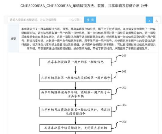 專利摘要顯示,本申請(qǐng)公開了一種車輛解鎖方法,該方法先獲取第一用戶的第一指紋信息,第一指紋信息是通過第一指紋采集模組采集的,第一指紋采集模組安裝在共享車輛上,且第一指紋信息用于請(qǐng)求解鎖共享車輛;然后獲取第一指紋信息關(guān)聯(lián)的第一用戶賬號(hào);解鎖共享車輛,關(guān)聯(lián)第一用戶賬號(hào)和共享車輛,用于基于第一用戶賬號(hào),對(duì)使用共享車輛產(chǎn)生的資源信息進(jìn)行統(tǒng)計(jì)。
