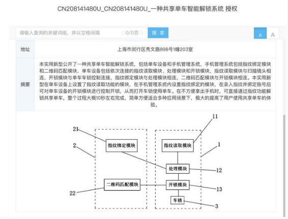 南都記者檢索發(fā)現(xiàn),不僅美團(tuán),包括哈啰出行、青桔單車在內(nèi)的多家共享單車所屬公司均曾公布或擁有“指紋解鎖共享單車”相關(guān)專利。