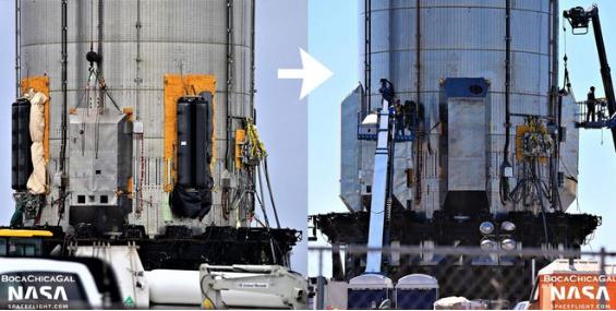 在安裝主要的 Aerocover 之前,SpaceX 還先安裝了至少六個(gè)小盒子,這應(yīng)該是為了保護(hù)某些重要的金屬探測(cè)器,它們可以穿過超重型助推器的儲(chǔ)罐和外殼,并連接到了航空電子設(shè)備盒內(nèi)部。此后,項(xiàng)目團(tuán)隊(duì)還完成了 BN4 的猛禽發(fā)動(dòng)機(jī)熱屏蔽系統(tǒng),使用了大量類似的鋼板蓋和面板。