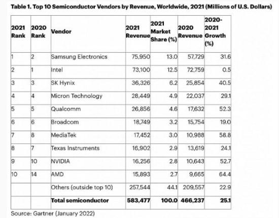 據(jù)美國(guó)研究機(jī)構(gòu) Gartner 的數(shù)據(jù),2021 年半導(dǎo)體市場(chǎng)增長(zhǎng)了 25.1%,達(dá)到 5835 億美元,銷售額首次突破 5000 億美元。而三星超過(guò)英特爾,成為年收入最高芯片制造商。