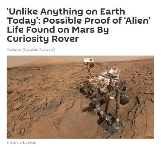 據(jù)俄羅斯衛(wèi)星通訊社19日報道,根據(jù)發(fā)表在《美國國家科學(xué)院院刊》的一項新研究,美國NASA“好奇號”探測器在火星上發(fā)現(xiàn)了一種不尋常的碳信號,這可能會證明外星生命的確存在過。