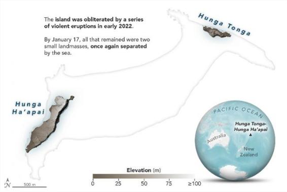 NASA 地球觀測(cè)站的數(shù)字高程地圖也顯示了洪阿哈阿帕伊島發(fā)生的劇烈變化。在本月早些時(shí)候火山噴發(fā)前,兩個(gè)無(wú)人居住的島嶼被火山錐合并成一個(gè)新陸地。