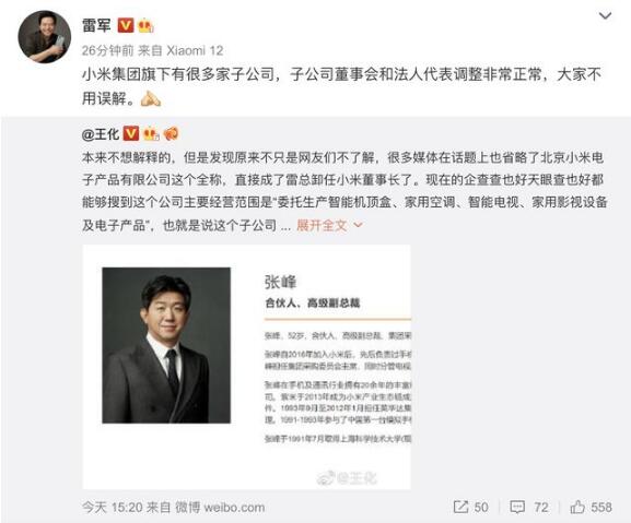 而雷軍隨后也轉(zhuǎn)發(fā)了王化的微博并表示:小米集團旗下有很多家子公司,子公司董事會和法人代表調(diào)整非常正常,大家不用誤解。