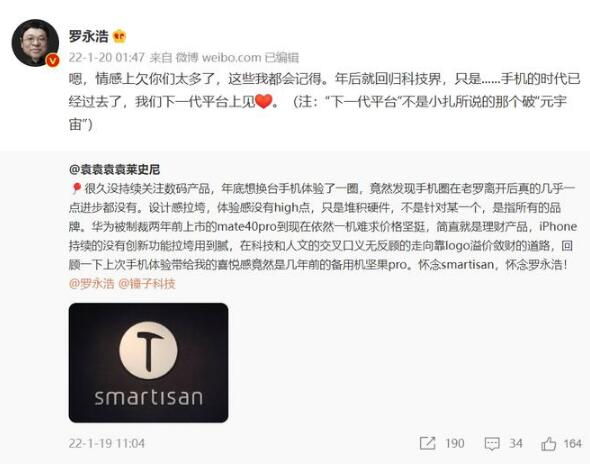 2021年10月,羅永浩曾稱明年春天就重返科技行業(yè)了,而且是還完債的當(dāng)天就會(huì)回去。今年1月20日羅永浩更是通過社交媒體表示,年后就回歸科技界,只是手機(jī)的時(shí)代已經(jīng)過去了,并稱“下一代平臺(tái)上見”。