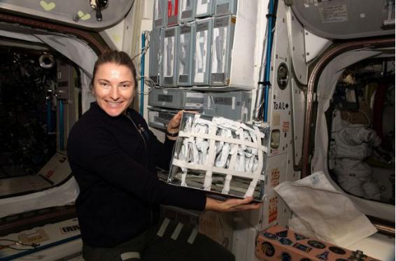 美國宇航局宇航員凱拉-巴倫在空間站的統(tǒng)一艙上展示食物包并準備午餐。