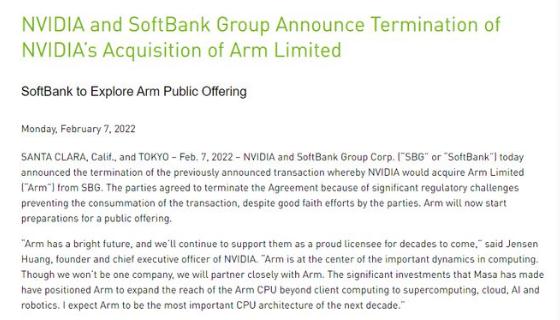 2 月 8 日消息,當(dāng)?shù)貢r(shí)間周一,美國(guó)芯片巨頭英偉達(dá)和日本軟銀集團(tuán)正式宣布,終止此前有關(guān)英國(guó)芯片設(shè)計(jì)公司 Arm 的收購(gòu)交易。盡管雙方做出了巨大努力,但由于重大監(jiān)管挑戰(zhàn)阻礙了交易的完成,雙方同意終止協(xié)議。Arm 現(xiàn)在將開始為首次公開募股(IPO)做準(zhǔn)備。