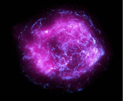 圖中,紫紅色與 IXPE 觀察到的X射線強度相對應,它覆蓋了來自 NASA 錢德拉X射線天文臺的高能X射線數(shù)據(jù)(藍色所示)。錢德拉天文臺 1999 年發(fā)射,被譽為“X射線領域的哈勃”,是當時最強大的X射線望遠鏡,它同樣對準銀河系內(nèi)最年輕的超新星遺跡“仙后座A”拍下了第一張照片。