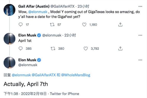 馬斯克在個人社交媒體 Twitter 上確認,這次活動將于 4 月 7 日舉行。最初馬斯克表示活動將于 4 月 1 日舉行。馬斯克可能很快意識到當天是愚人節(jié),為了避免任何不必要的誤會,所以又把德克薩斯州超級工廠的慶?;顒油七t了六天,以避免任何潛在的混亂。