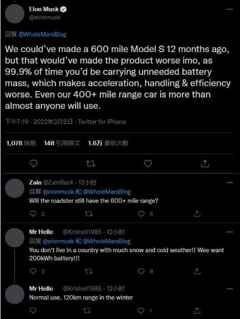 馬斯克在推文中說:“早在12個月前,我們本可以生產續(xù)航里程達900公里的Model S,但在我看來,那會讓產品變得更糟,因為在99.9%的情況下,你會攜帶額外重量的電池,這會讓加速、操控和效率更差。即使我們640公里的續(xù)航里程,也幾乎超過了所有人的需求。”