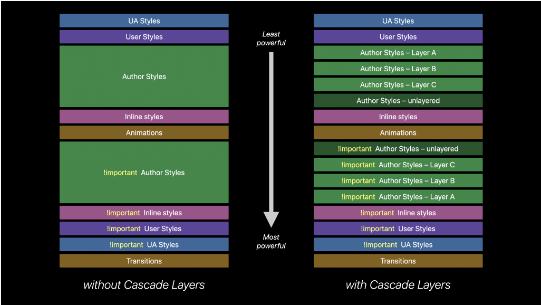 有了這個標準,網站可以創(chuàng)建一個“框架”層和一個“自定義”層,然后將所有第三方框架的 CSS 樣式分配到框架層,在自定義層中編寫自定義樣式,而且自定義層的所有 CSS 樣式,優(yōu)先級都可以比框架層要高(無視選擇器)。