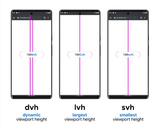 新的視窗單位考慮包含標題欄的布局,引入了最大、最小和動態(tài)視窗單位,比如 100svh 指 100% 最小可能視窗高度,100lvh 指 100% 最大可能視窗高度,100dvh 指 100% 動態(tài)視窗高度——該值將隨著用戶滾動而改變。