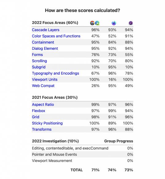從根本上講,Interop 2022 是一個不斷發(fā)展的指標,用于評估各大瀏覽器對上述 Web 標準的兼容程度。Interop 2022 儀表板 有一個評分系統(tǒng),評估各大瀏覽器的整體兼容程度:
