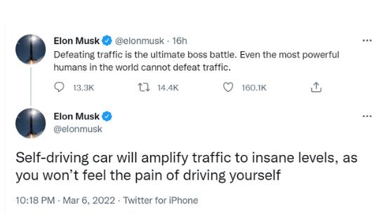 馬斯克隨后表示,自動駕駛汽車可能會使交通狀況變得更糟。馬斯克寫道:“自動駕駛汽車將把交通放大到瘋狂的程度,因為你不再會感到自己開車的痛苦。”