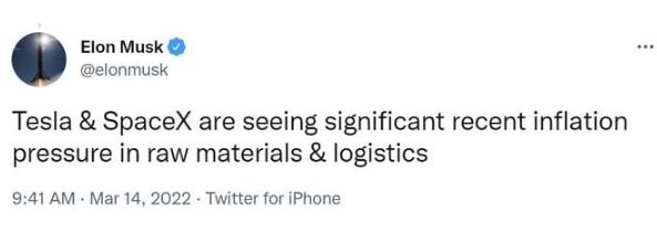 今日上午,特斯拉CEO、SpaceX CEO埃隆?馬斯克(Elon Musk)通過(guò)社交媒體表示,特斯拉和 SpaceX 最近在原材料和物流領(lǐng)域面臨著巨大的通脹壓力。