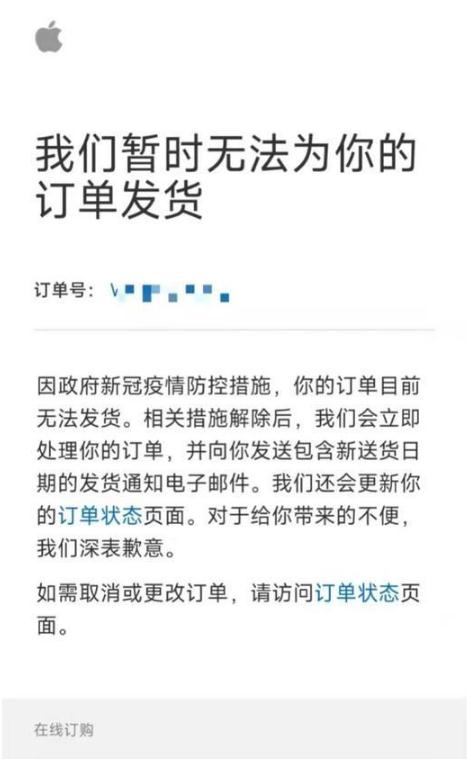 蘋果表示,“ 因政府新冠疫情防控措施,你的訂單目前無法發(fā)貨。相關(guān)措施解除后,我們會(huì)立即處理你的訂單,并向你發(fā)送包含新送貨日期的發(fā)貨通知電子郵件。我們還會(huì)更新你的訂單狀態(tài)頁面。對(duì)于給你帶來的不便,我們深表歉意。如需取消或更改訂單,請(qǐng)?jiān)L問訂單狀態(tài)頁面。”