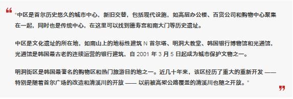 中區(qū)以其歷史建筑、傳統(tǒng)市場和高檔零售店的混合而聞名。它也是標(biāo)志性的東大門德興廣場墻的所在地。