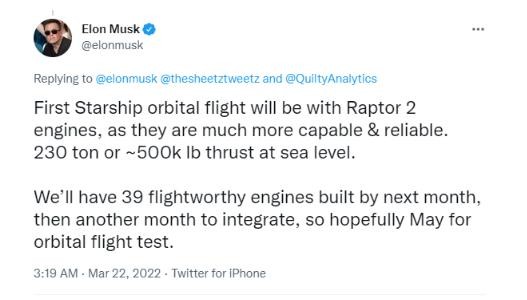 馬斯克在推特上稱:“到下個(gè)月,我們將制造出 39 個(gè)適合飛行的引擎,然后再花一個(gè)月進(jìn)行整合,希望 5 月份能進(jìn)行軌道飛行測(cè)試。”