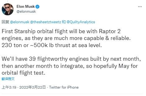馬斯克在推特上表示:“到下個月,我們將制造出 39 個飛行引擎,然后再花一個月進行整合,有望在 5 月份能進行軌道飛行測試。”