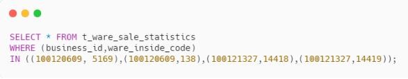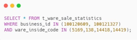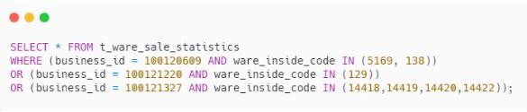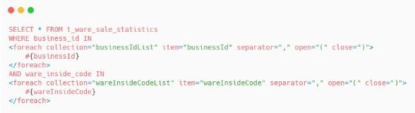 同樣是利用 Mybatis 的 動態(tài) SQL ,將 business_id 列表拼在一起、 ware_inside_code 拼在一起,類似如下