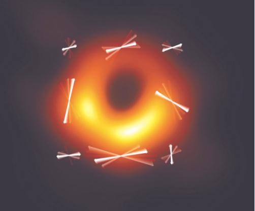 “甜甜圈”狀的結(jié)構(gòu)來自于黑洞周圍吸積流的輻射——黑洞吞噬了中心區(qū)域的光線,在“甜甜圈”內(nèi)形成了一個(gè)大陰影。兩年后,EHT 更新了一張照片,在原有基礎(chǔ)上展示了更精細(xì)的結(jié)構(gòu)——表示線偏振方向的紋理線,黑洞在線偏振光下的圖像猶如裱花圖樣,被稱為“甜甜圈”的裱花版。
