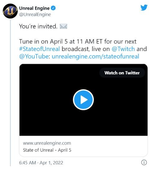 虛幻引擎官方網(wǎng)站上的公告稱:“在 4 月 5 日加入我們的 State of Unreal 直播,我們將在這里探索游戲未來的發(fā)展趨勢 —— 并宣布一些令人興奮的消息。”
