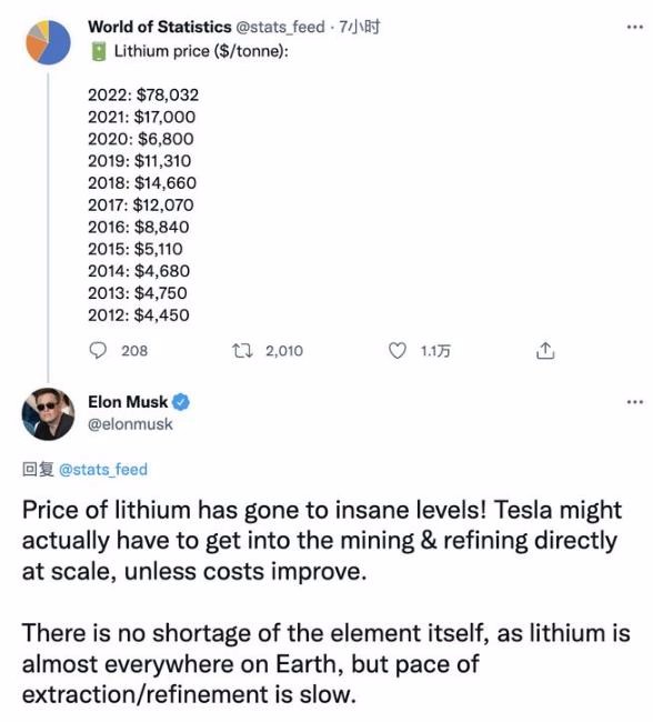 當(dāng)?shù)貢r(shí)間周五特斯拉首席執(zhí)行官埃隆·馬斯克(Elon Musk)在個(gè)人社交媒體上發(fā)文稱,特斯拉可能會(huì)直接大規(guī)模打入鋰礦開采以及提煉領(lǐng)域,因?yàn)樽鳛橹圃祀姵氐年P(guān)鍵元素,鋰價(jià)已經(jīng)達(dá)到了“瘋狂”水平。