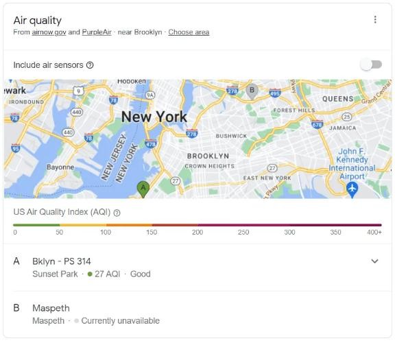 谷歌首先在印度發(fā)布了該功能(現(xiàn)在也可以在澳大利亞維多利亞州使用),現(xiàn)在正在通過 airnow.gov 和 PurpleAir 的幫助將其帶到美國(guó)的搜索服務(wù)中。移動(dòng)端和桌面端網(wǎng)絡(luò)用戶可以輸入他們想查詢的美國(guó)城市,搜索會(huì)提供指定位置的信息。用戶可以輸入“波士頓的空氣質(zhì)量”或“布魯克林的空氣質(zhì)量”。例如,截至撰寫本文時(shí),布魯克林市的 AQI 為 27,空氣質(zhì)量?jī)?yōu)良。