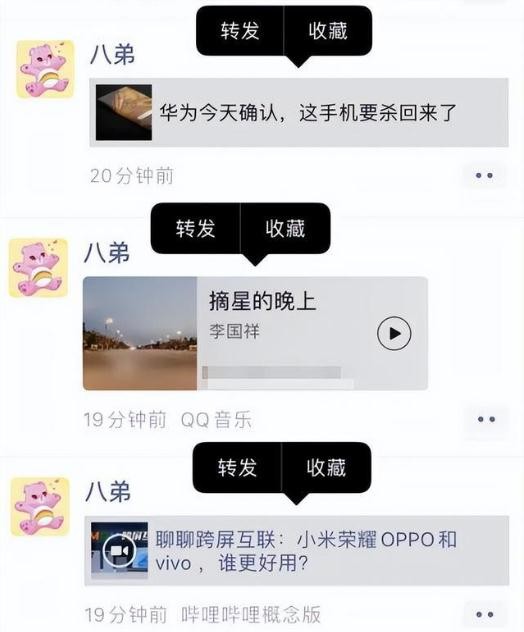 像公眾號推文、歌曲、視頻分享等等,都支持轉(zhuǎn)發(fā)功能。