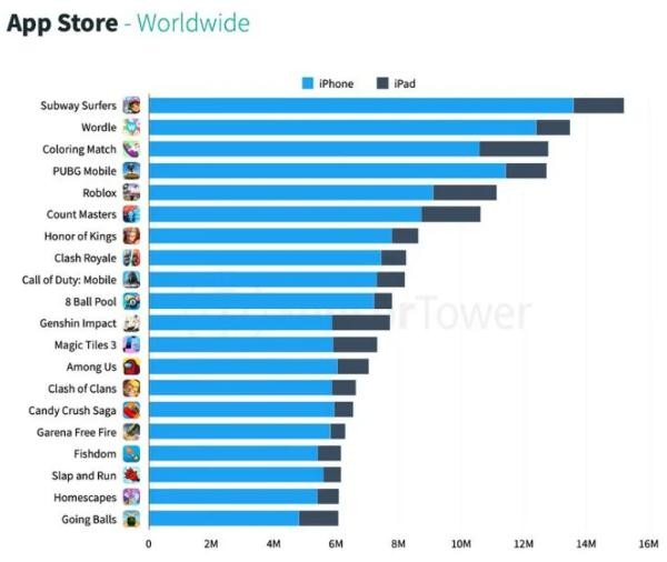 游戲方面,《地鐵跑酷》是下載次數(shù)最多的游戲,2022 年一季度的下載量超過 1500 萬次。