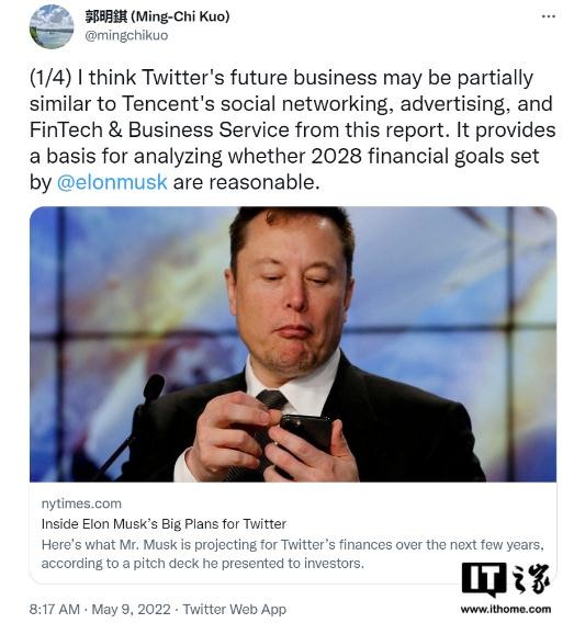 天風國際分析師郭明錤通過 Twitter 表示,其認為 Twitter 未來的業(yè)務可能與騰訊的社交網(wǎng)絡、廣告、金融科技和商業(yè)服務有部分相似之處。