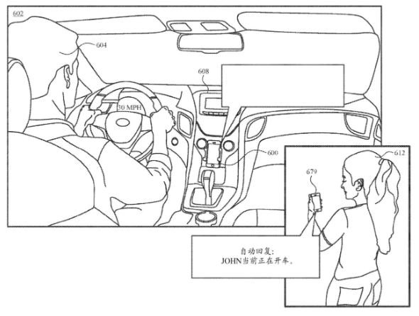 從專利圖可以看到,當(dāng)用戶在開車時(shí),iPhone 手機(jī)將自動(dòng)回復(fù)“JOHN(用戶名稱)當(dāng)前正在開車”,似乎會(huì)檢測(cè)用戶的車速,從而自動(dòng)開啟該功能。