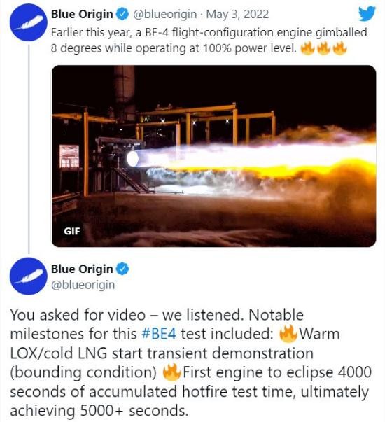 藍(lán)色起源公布的視頻顯示,BE-4 發(fā)動(dòng)機(jī)在關(guān)鍵測(cè)試中超過(guò)一分鐘,該火箭將用于 New Glenn 火箭。BE-4 火箭發(fā)動(dòng)機(jī)能夠達(dá)到 550000lbf 的推力,超過(guò)了 SpaceX 第二代猛禽發(fā)動(dòng)機(jī)的 530000lbf。