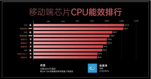 通過極客灣分享的移動芯片能效排行榜來看,以驍龍 865 為基準,取 3W-5W 功耗段多核性能計算能效,數(shù)據(jù)顯示,蘋果 A14 當之無愧的位于排行榜榜首,達到了 123.8。不過,第二名竟然是聯(lián)發(fā)科的天璣 8100,以 122.7 的成績相當接近第一名的蘋果 A14,并且遠超高通陣營,堪稱安卓最節(jié)能處理器。