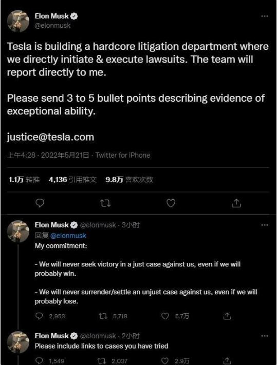 馬斯克在推特上宣布:“特斯拉正在組建核心訴訟部門,我們將直接發(fā)起和執(zhí)行訴訟。這個(gè)團(tuán)隊(duì)將直接向我匯報(bào)工作。”
